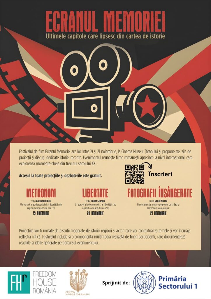 Proiectul “Ecranul Memoriei: Tinerii în Fața Istoriei” a fost finanțat prin Programul de Fonduri Nerambursabile de la bugetul local al Sectorului 1 pentru activități nonprofit de interes local, în conformitate cu H.C.L. nr. 82/2025, implementat de Fundația Freedom House România.